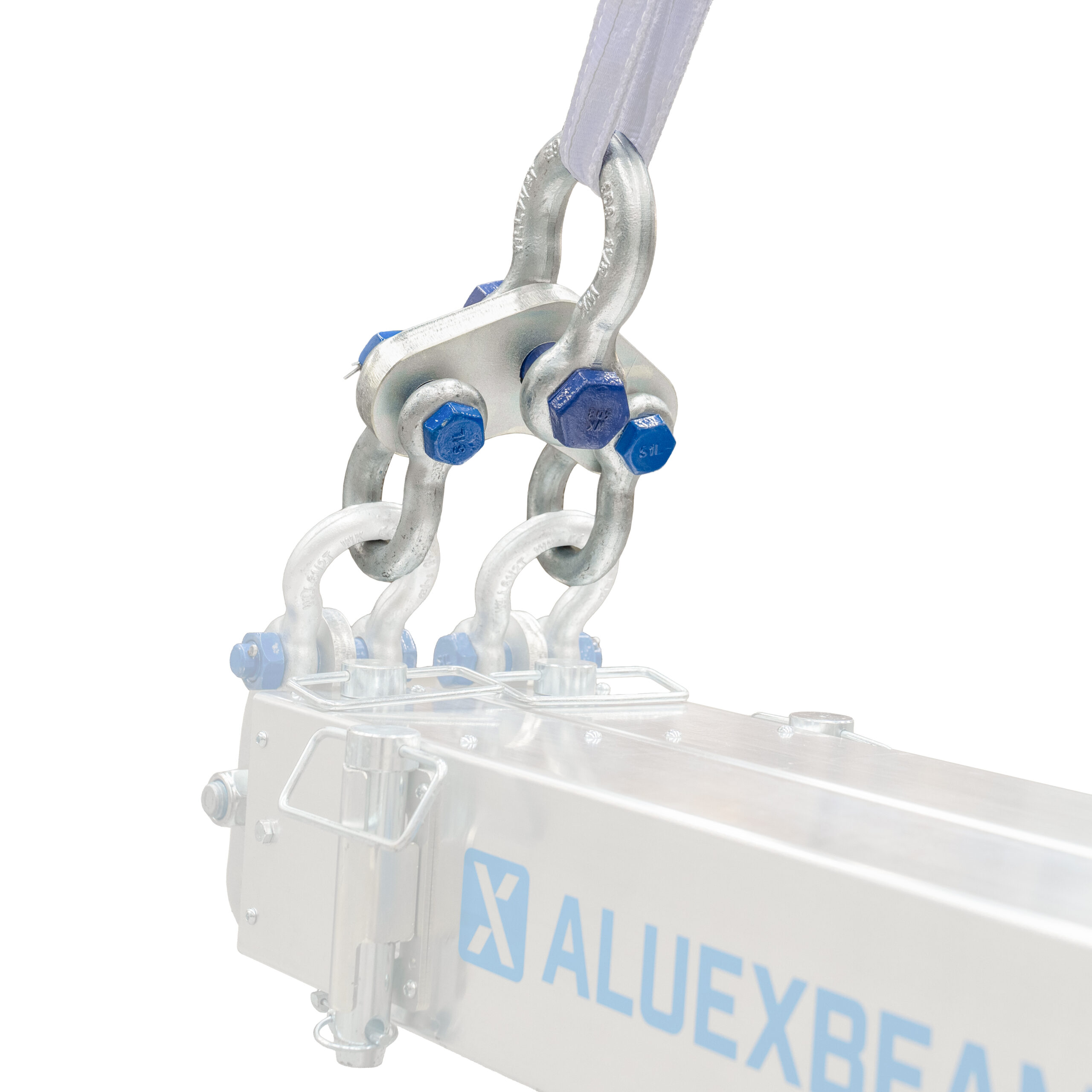 Die Aluex Kupplung (Aluex Link) ist eine dreieckförmige Vorrichtung, die die Schenkel einer 4-Punkt-Kreuztraverse miteinander verbindet und sie in eine 2-Punkt-Traverse verwandelt. Sie kann auch als Lastausgleichsvorrichtung dienen, die es Ihnen ermöglicht, die Last von einem auf zwei Hebepunkte zu verteilen. Somit sind aus einer 4-Punkt-Traverse auch eine 8-Punkt-Traverse zu realisieren.