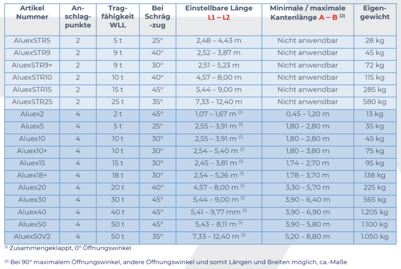 Durch das Aufklappen der Kreuzspreizen wird ein Kreis beschrieben mit einem Durchmesser, der der Länge der Aluex entspricht. Je nach Abstand der 4 Lastpunkte in Längs- und Querrichtung klappt das Kreuz mehr oder weniger auf. Der maximale Aufklappwinkel (oder Öffnungswinkel) beträgt dabei 90°.